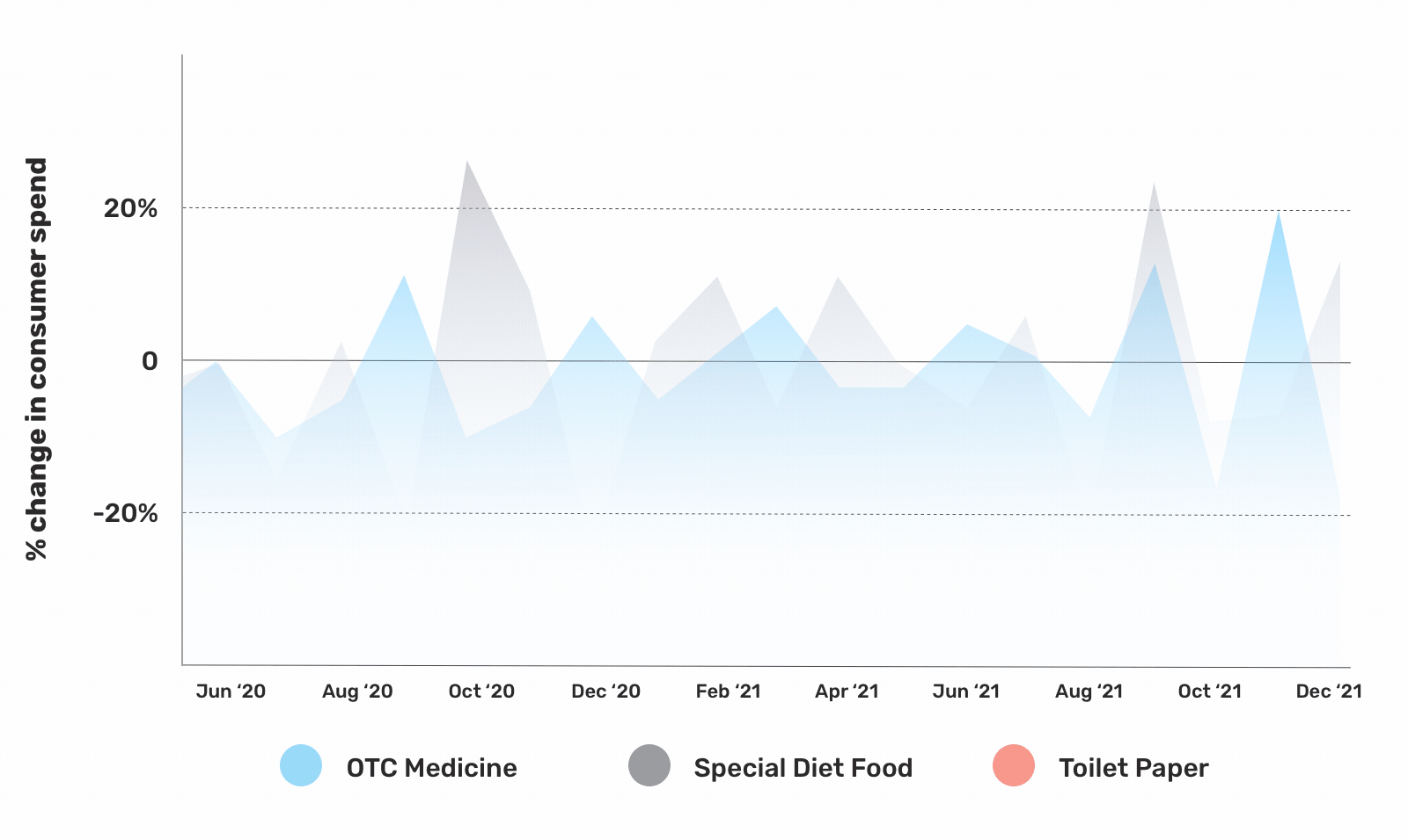 Looking ahead, we used the “panic-purchase” consumer behaviour signals from the initial crisis period of the pandemic to predict if a similar behaviour will be seen in the future. While the toilet paper purchase sky-rocketed during the onset of Spring 2021, however, this trend is not pervasive. Based on our prediction models, the average consumer spend on toilet paper is expected to decrease at an approximate monthly rate of 10% in the next quarter.